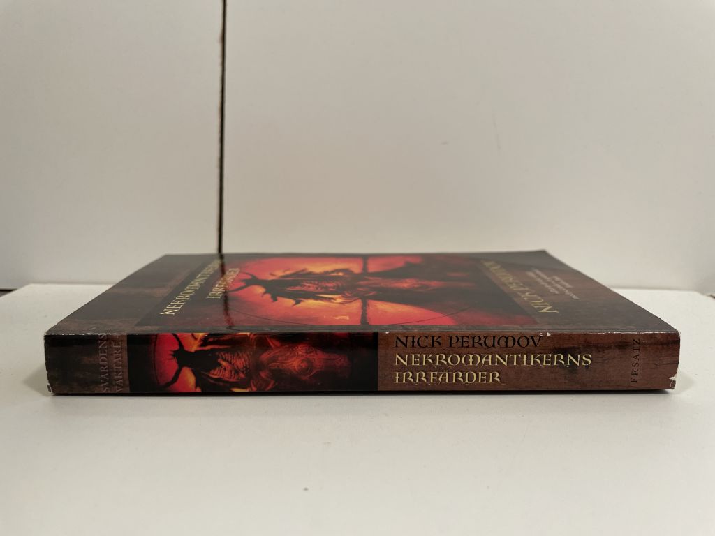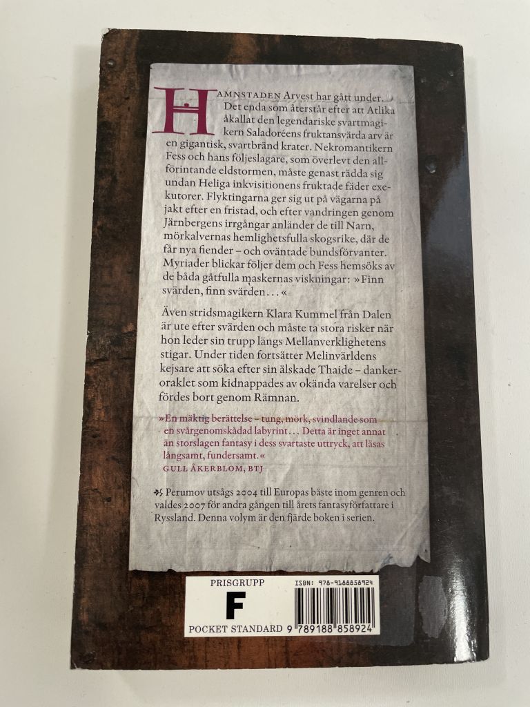Hamnstaden Arvest har gått under. Det enda som återstår efter att Atlika åkallat den legendariske svartmagikern Saladoréens fruktansvärda arv är en gigantisk, svartbränd krater. Nekromantikern Fess och hans följeslagare, som överlevt den allförintande eldstormen, måste genast rädda sig undan Heliga inkvisitionens fruktade fäder exekutorer. Flyktingarna ger sig ut på vägarna på jakt efter en fristad och efter vandringen genom Järnbergens irrgångar anländer de till Narn, mörkalvernas hemlighetsfulla skogsrike, där de får nya fiender – och oväntade bundsförvanter. Myriader blickar följer dem och Fess hemsöks av de båda gåtfulla maskernas viskningar: »Finn svärden, finn svärden, finn svärden…«